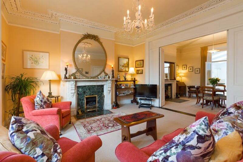 The drawingroom on the left also features elaborate plasterwork, a tall deep bay window and a large marble fireplace; folding double doors in a wide arch open from here into the diningroom, with a more modest cast-iron fireplace and less elaborate cornicing.