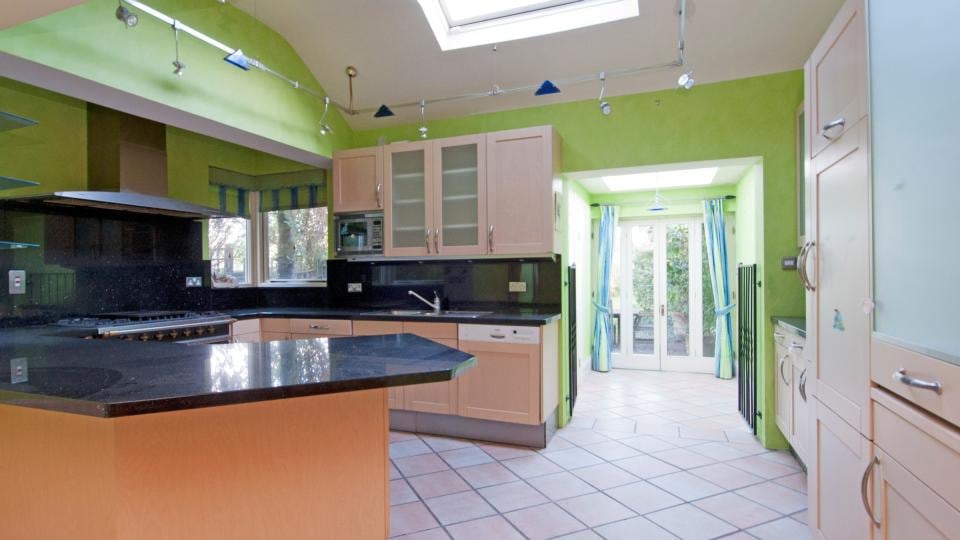 This made space for an open-plan kitchen and dining area as well as a utility room with two sets of double doors opening out onto the back garden. The kitchen is a family friendly space being well planned with good storage and work surfaces.