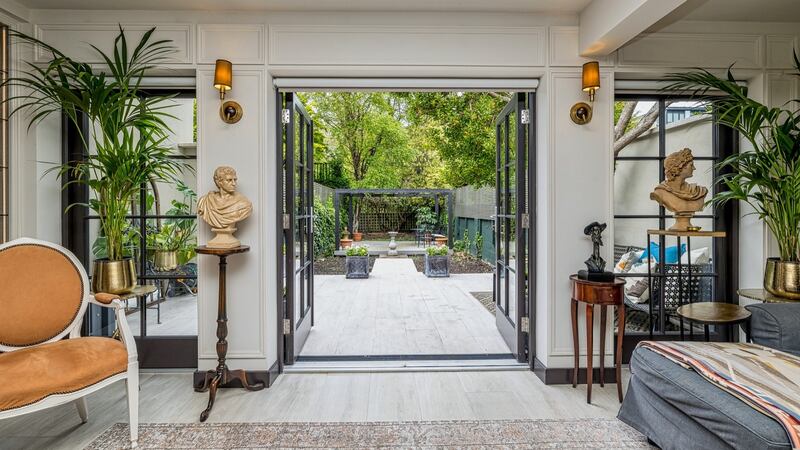 Ensko describes the decor as classical, for there are both Greek and Roman motifs at play throughout. The front room, now a guest bedroom/study, is accessed via glass-panelled sliding doors and has a Greek key detail in its bespoke joinery, on its Cole & Son frieze and custom curtains.