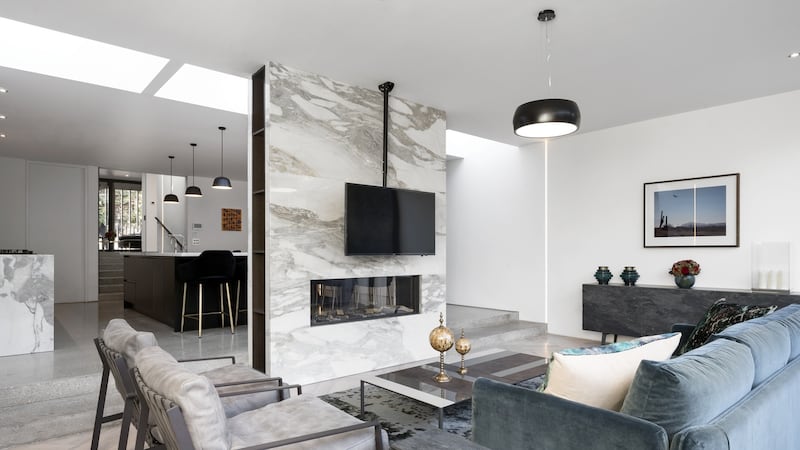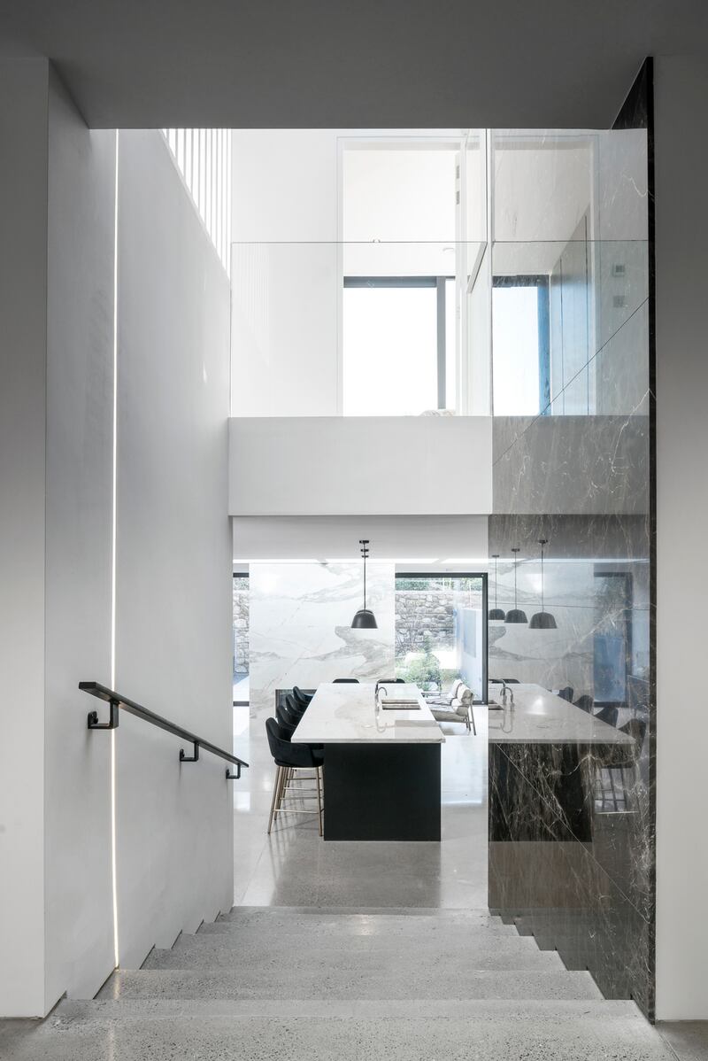 Flooring throughout is a mixture of oiled white oak set in herringbone in both living rooms and polished poured concrete. The lack of coving and skirting creates a streamlined effect, echoed in the kitchen by Bushell Interiors. The absence of sockets – hidden in pop-up ports along with the extractor fan – and an oven concealed in the pantry lends the kitchen a minimalist feel, enhanced by the Calacatta marble on the giant island and splashback.