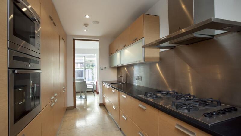 The semi-detached house is accessed via electronic gates. The hall opens into the dining room where the eating area is situated in a west-facing box bay window that overlooks the cobblelocked front. Off it is a long, narrow windowless galley kitchen with polished black granite countertops and stainless steel splashbacks.