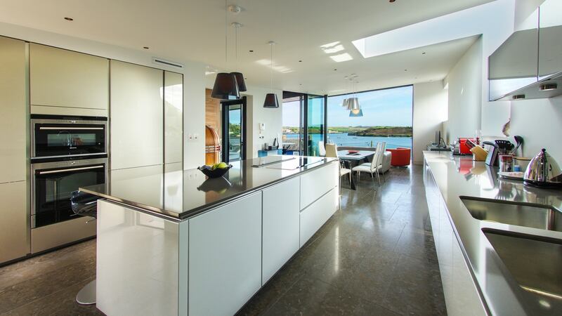 The front of the house on the upper level features triple-glazed walls of glass which slide back to bring the views and the sea air inside. The streamlined kitchen, by London-based LWK with Siemens appliances, opens on to a terrace which also links to the living room. The terrace has slats overhead which close over in the rain, and open during sunshine – allowing for year round use.