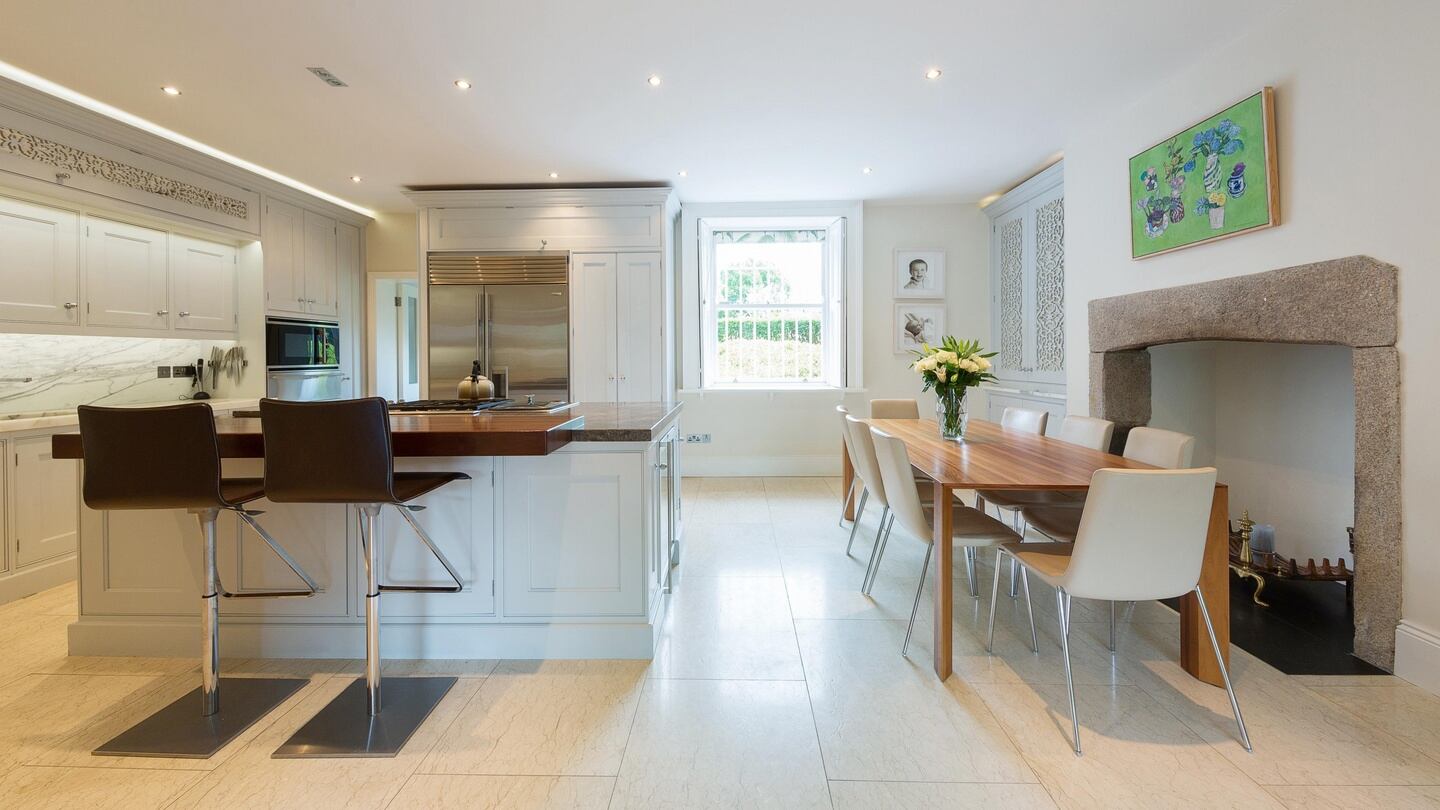 The garden level has a beautiful and bright kitchen by Design House Dalkey, with a Carrara marble (the same marble as Michelangelo's David) counter around the sink. This is balanced by a darker marble island unit with a walnut breakfast bar.