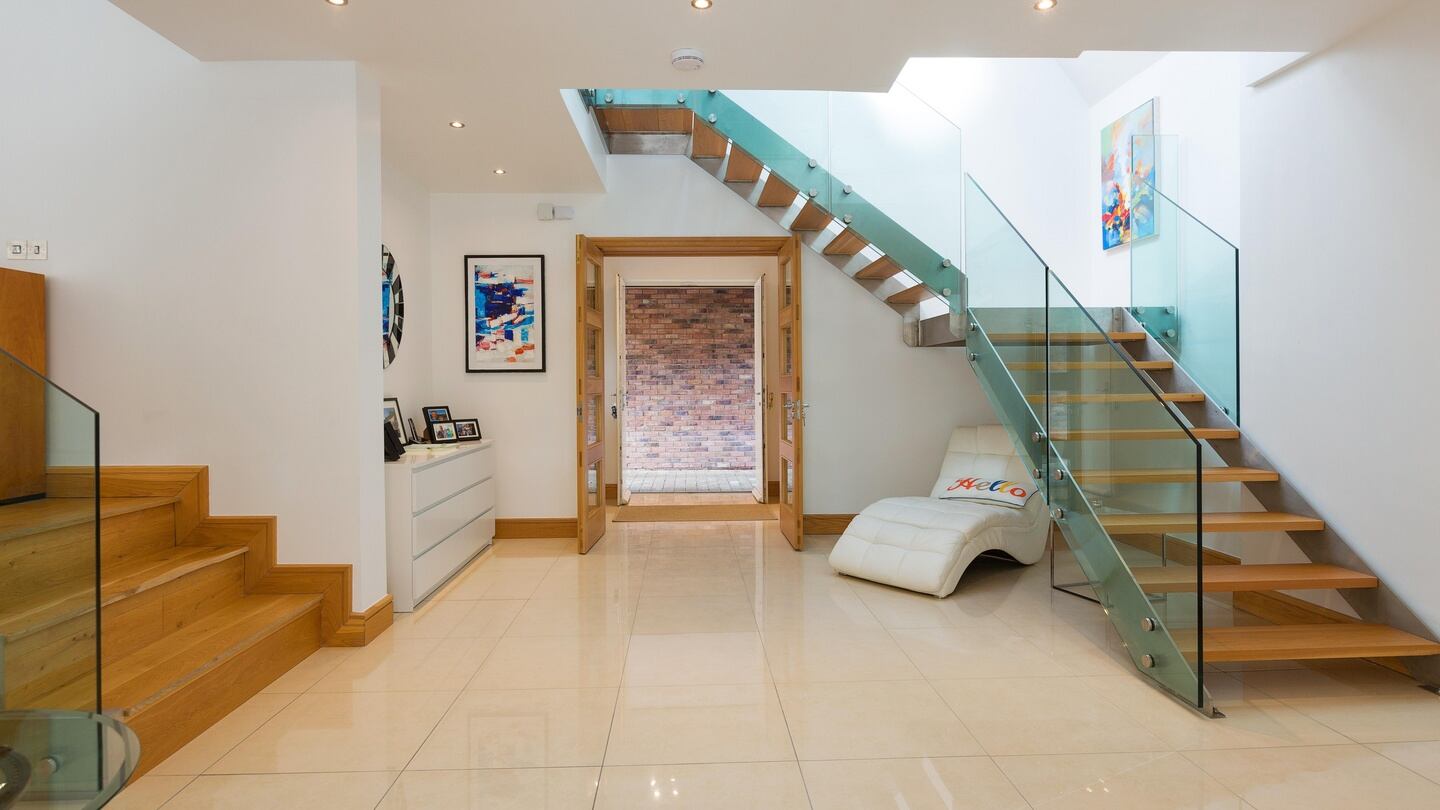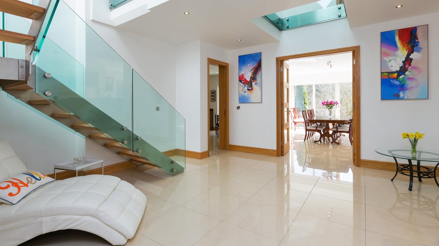 The house has a large wow-factor entrance. The square-shaped double height hall is lit from above by rooflights on either side of its pitched ceiling. The house is set out as two wings with doors leading off the hall to each area. Underfoot there is crema marfil tiling that extends into the kitchen, to the right, where there are vanilla gloss units and Corian worktops. The same flooring is in the TV room and the formal dining room.