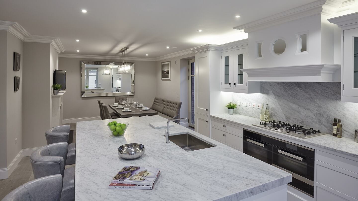 There’s a very large open-plan kitchen and dining area with two sets off double doors giving access out to the patio. The Dalkey Design painted timber kitchen features a large marble-topped island unit. The flooring throughout this area is oak. There’s a small utility room. Across the small hall is a room that again could be a bedroom – it’s beside a bathroom – and opens directly out onto the patio at the rear.