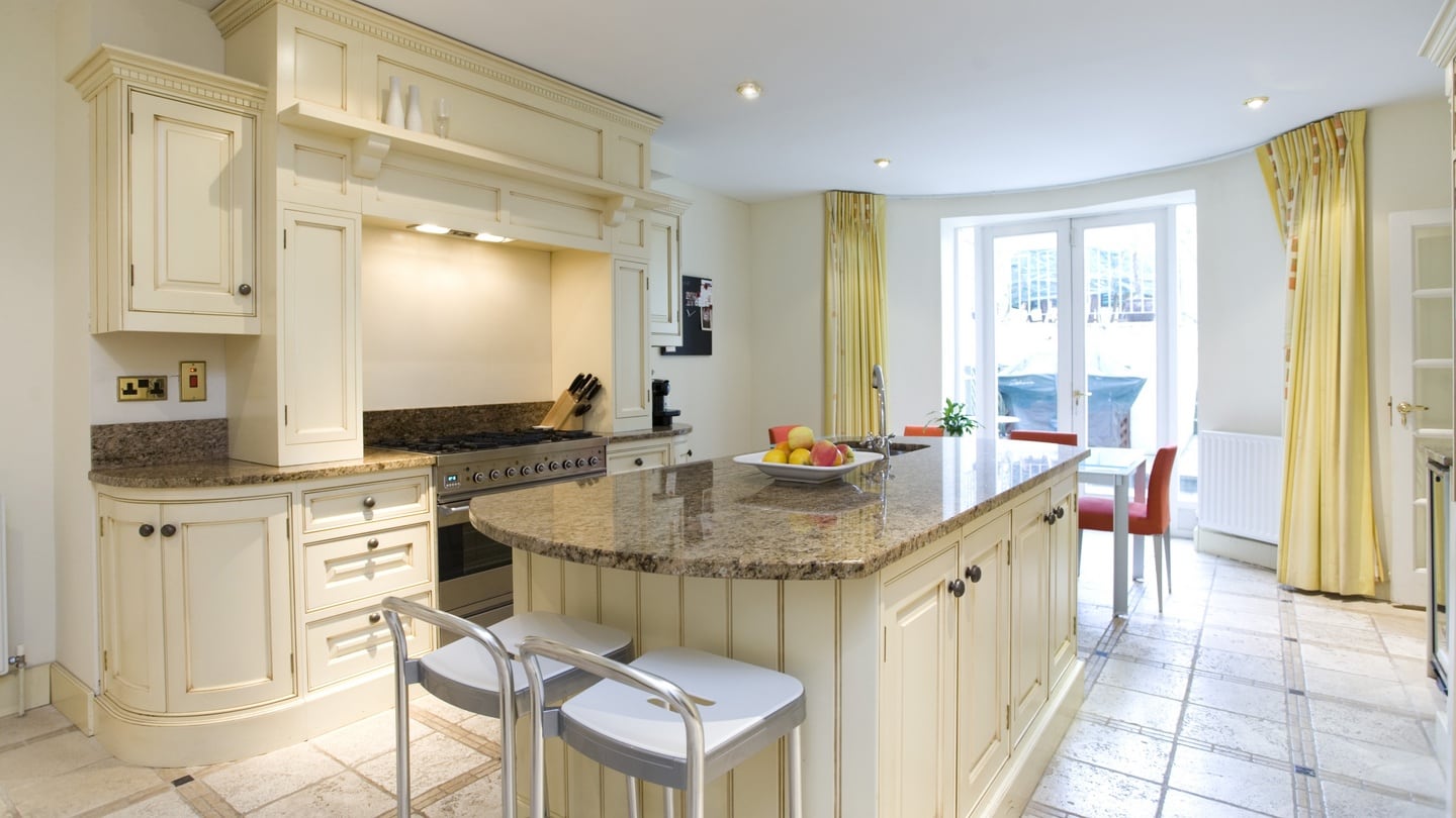 The smart kitchen/ breakfastroom from Design House in Dalkey has a tiled floor, cream units and polished marble worktops on counters and the island unit.