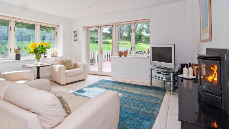 A half wall divides it from the living room,which has a solid fuel stove and French doors onto a west-facing deck.
