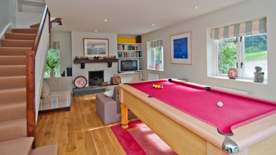 Off this sittingroom is a sizeable larder and utility with underfloor heating, useful for drying clothes out of sight. Steps lead down to a games room, where a staircase reveals a bedroom with rooflights and a Juliet balcony. This area could easily become a self-contained flat, or would suit an au pair as it is, giving all residents plenty of living space.