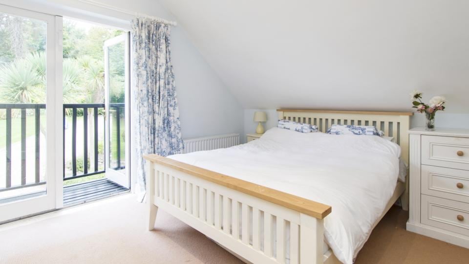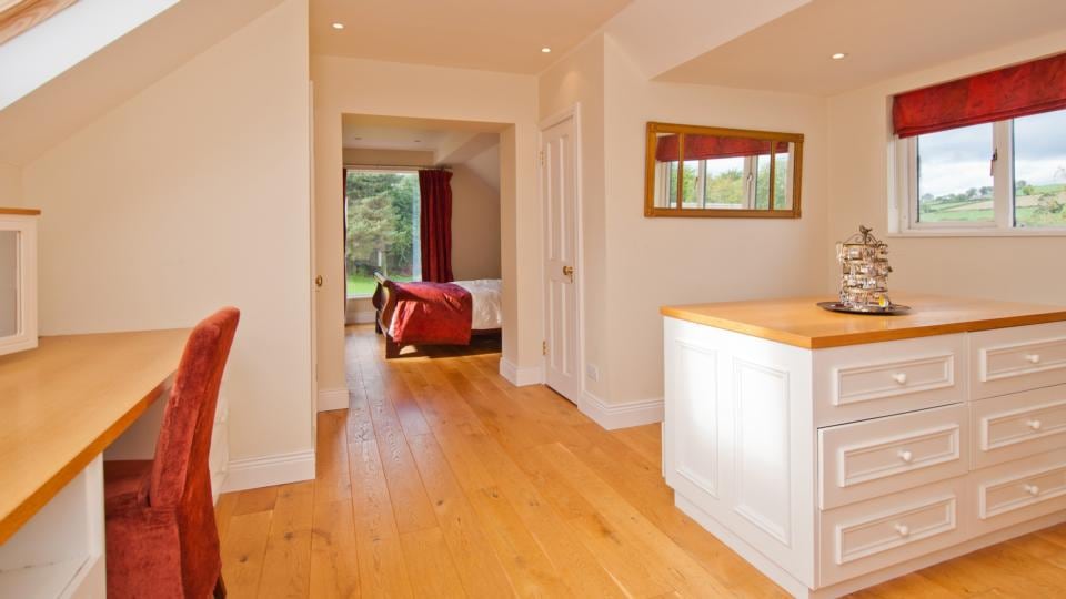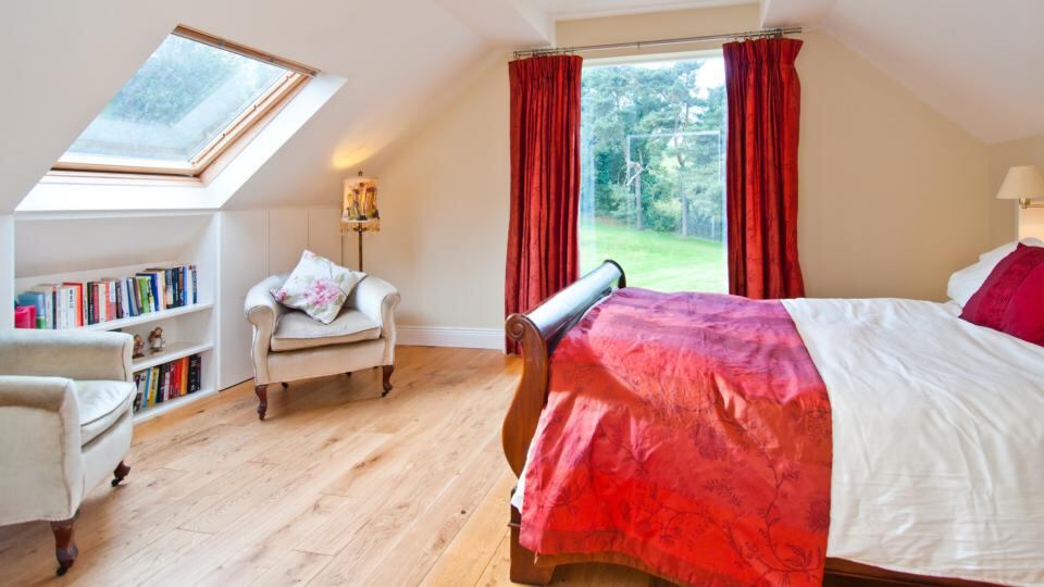 Upstairs the main bedroom has rooflights and floor-to-ceiling gable window with terrific country views.