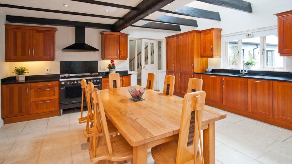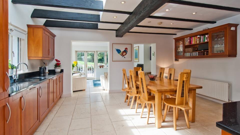 Veer left into the large kitchen where the stained-beam look has been replicated: it has cherry coloured units and a limestone floor. The windows over the sink face south and the room is further illuminated by two rooflights concealed above beams in a pitched area.