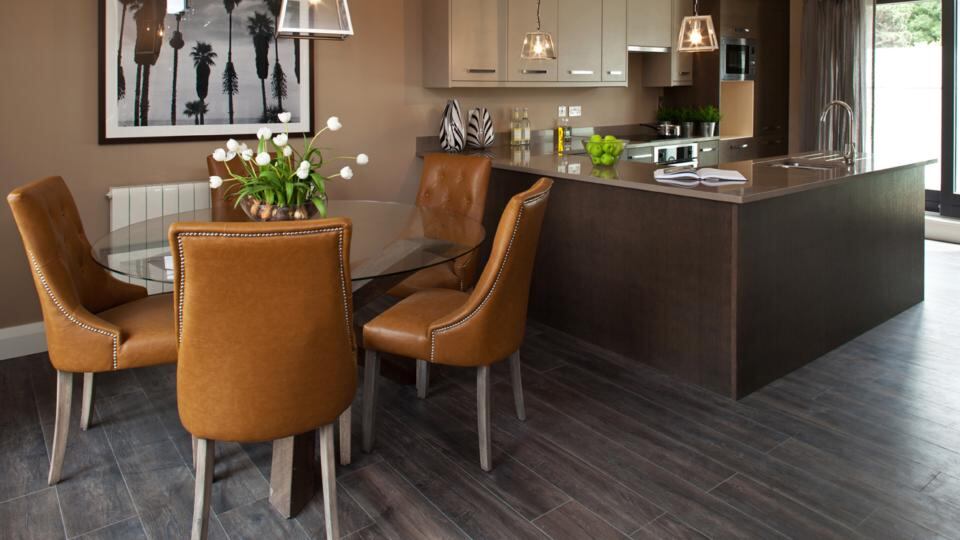 Four of the five houses have inverted living space, with the sleeping accommodation on the ground floor. The showhouse, decorated by Ventura Design, features lots of swish furnishing that sets off the marble bathrooms and smoked oak flooring.