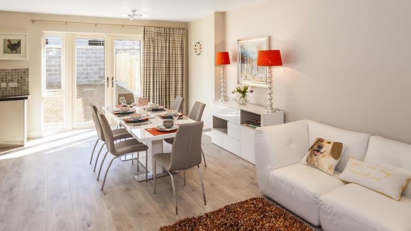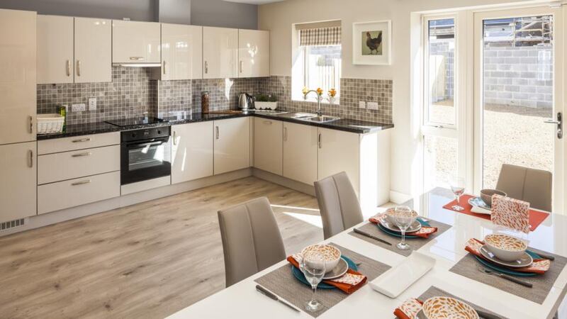 The four-bedroom houses have a livingroom to the front with a kitchen/diningroom in an L-shaped open plan to the rear. There are a toilet and a utility room on this floor too. The first-floor main bedroom is en suite and all the bedroom floors are timber.