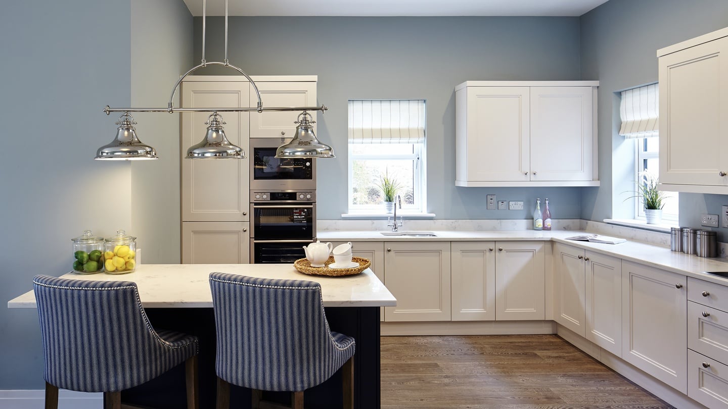 Stepped shaker kitchens by Cawleys Kitchens, include AEG appliances, remote control flush to ceiling extractor fans, and solid quartz countertops.