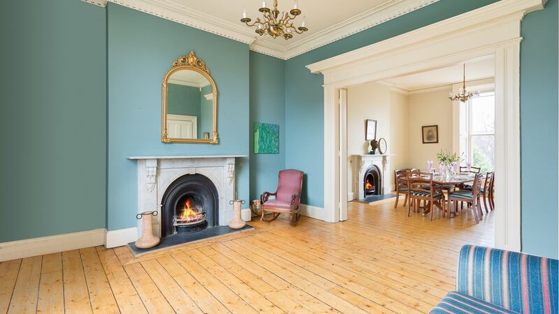 The interconnecting reception rooms are bathed in light with the living room to the front a shade of Blue Grey by Farrow & Ball.