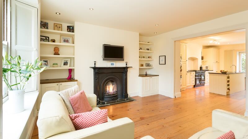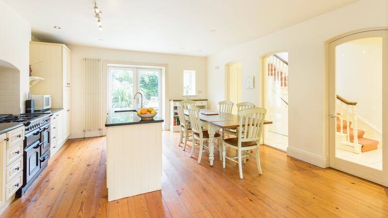 When the current owner bought it in 2000 there were earthen floors at garden level covered with quarry tiles which have since repurposed as a patio. It took two years for the architect and builder Bill Lawlor, now retired, to lovingly refurbish the property. They retained its original features including large sash windows and shutters, high ceilings at all levels (and particularly striking at garden level), pitch pine floorboards and fine cornicing and ceiling roses. The kitchen benefits from additional light from the hall thanks to the clever use of internal glazed panels in the dividing wall, set into the original brick arches.