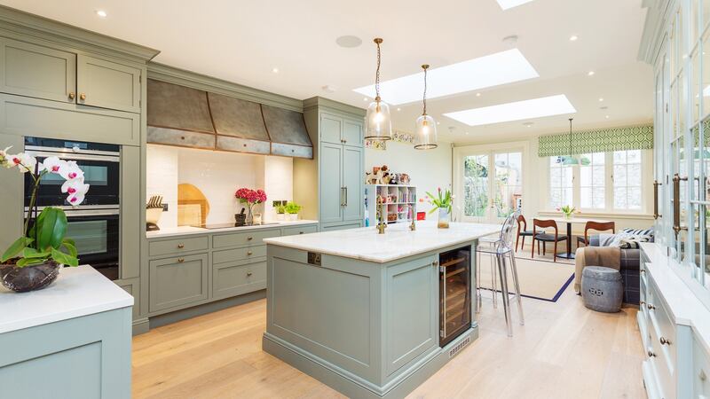 The kitchen, which has a large marble-topped island, is fitted with top brand appliances including two integrated Siemens smart ovens, a Neff flexzone hob and Liebherr double door French fridge. There’s also a filtered boiling tap and integrated CDA wine cave. Three large rooflights in the rear north-facing extension help make it a bright space.