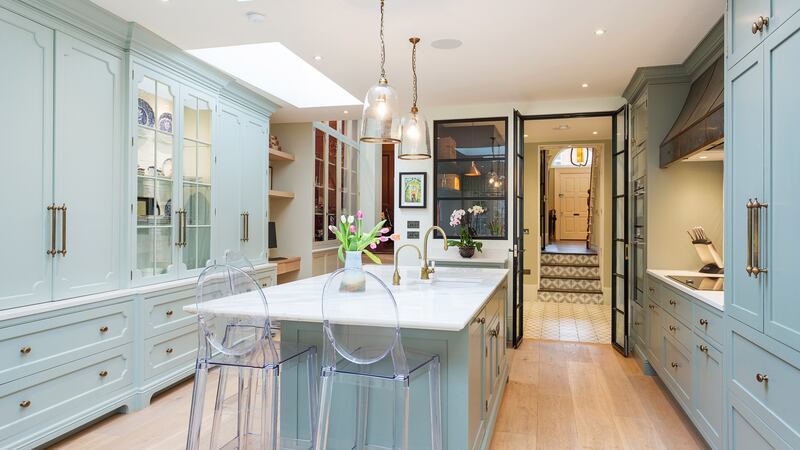 They also brought interior ideas from their old home, including clear plans for a very large eat-in kitchen with bespoke timber painted units that combine practicality and style, those Crittall metal folding doors with glazed side panels and a useful utility space floored with handmade encaustic tiles and custom-designed storage that features antique-style mirrored doors.