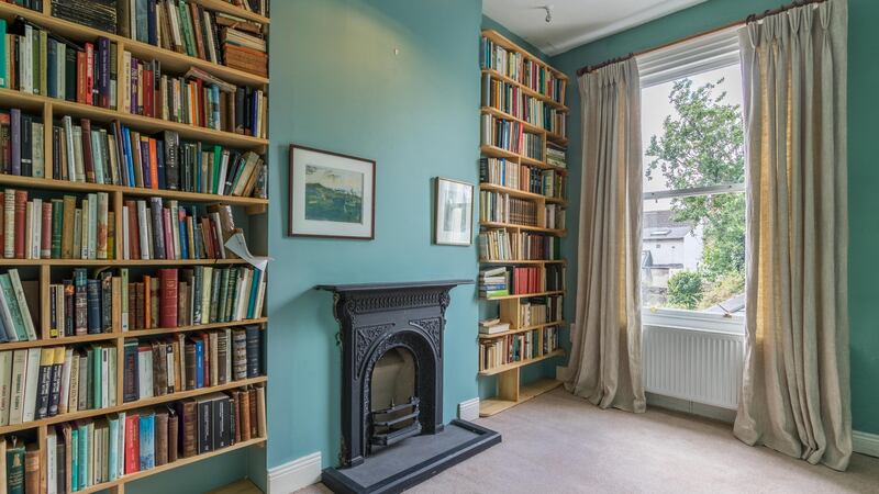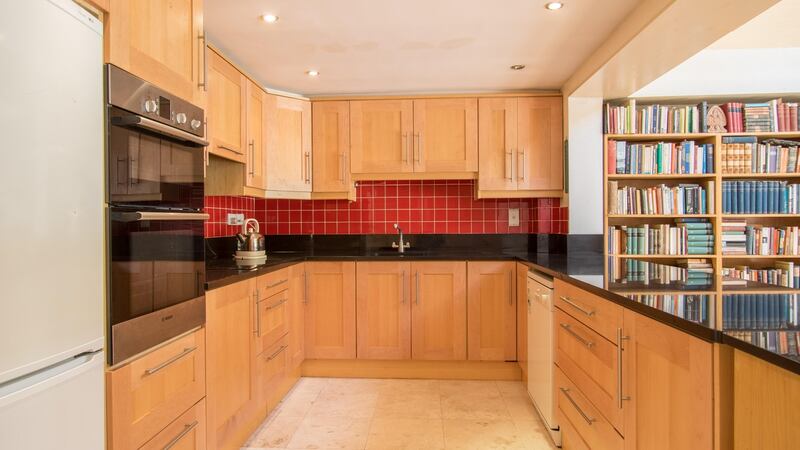 To the rear is a large, open-plan kitchen, living/diningroom that extends the house to 119sq m (1287sq ft). This work was done in 2007 and the owner used architect Micheal O Drisceoil whose design includes a Shaker-style kitchen area with polished black granite countertops that opens up to a large vaulted ceilinged room with a limed wood panelling ceiling. More bookshelves line these walls. The space made for books throughout the house really enhance it’s homeliness.
