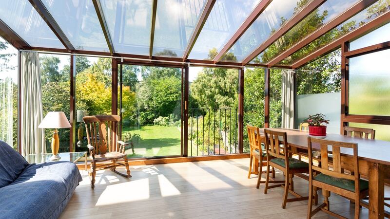 A few steps down at the end of the hall is the kitchen and, through a sliding glass door, the large conservatory with a glazed roof and walls overlooking the back garden: this was the owners’ main addition to the house.