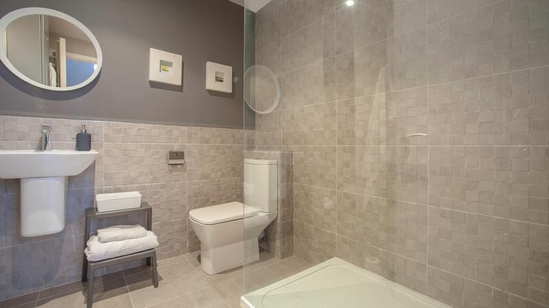 The kitchen – from Schuller and with Neff appliances – and the bathrooms have also been remodelled. The en-suite of the main bedroom, which is beside the front door, has a walk-in shower (with rainshower head) and deep, calming grey tones. The main bathroom, across the hall from the second bedroom, is also in grey with a free-standing bath.