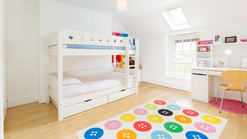A double bedroom at the back of the top floor is fitted out as a children’s bedroom; another double bedroom to the front, spanning the width of the top floor, has a dressingroom area behind the bed, separated by a partition.