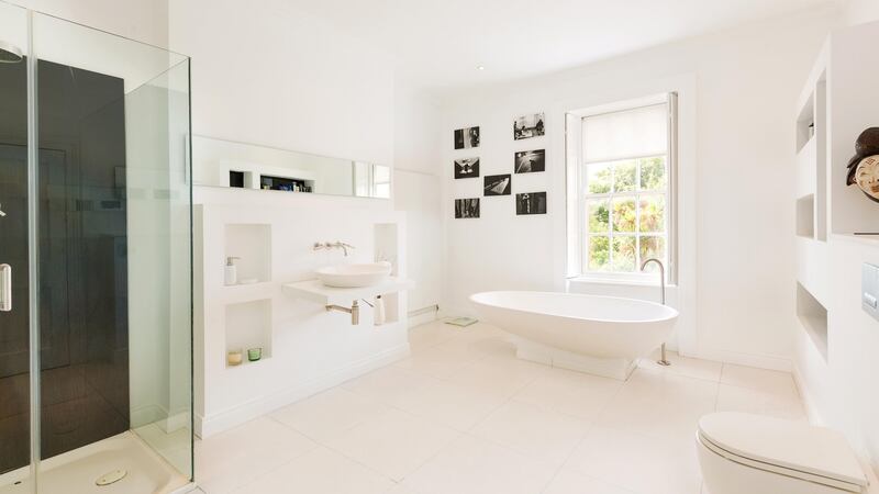 The very large family bathroom, with its oval bath and double shower, is on the first floor, next to the main bedroom stretching the width of the house overlooking Monkstown Road through three tall sash windows: it has an oak floor and marble fireplace. Bucking modern trends, the owner opted not to install en suite bathrooms with bedrooms.