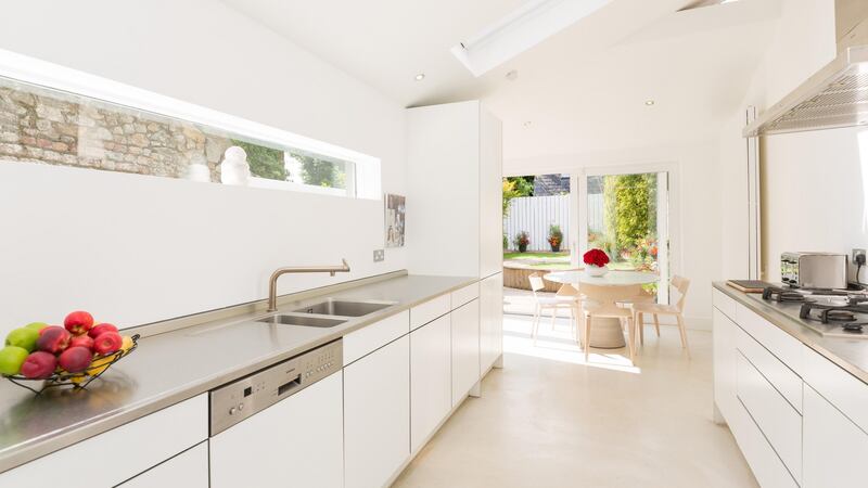 The owner had very clear ideas of what she wanted and Belfast architect Aidan McGrath implemented them. The interconnecting dining and living rooms, opening off the limestone-tiled front hall, have marble fireplaces. A few steps at the end of the front hall lead down to the long kitchen/breakfast room: it's bright, with Velux windows and a wide slit window over a countertop and two walls of sliding glazed doors opening from the breakfastroom into the small landscaped back garden.