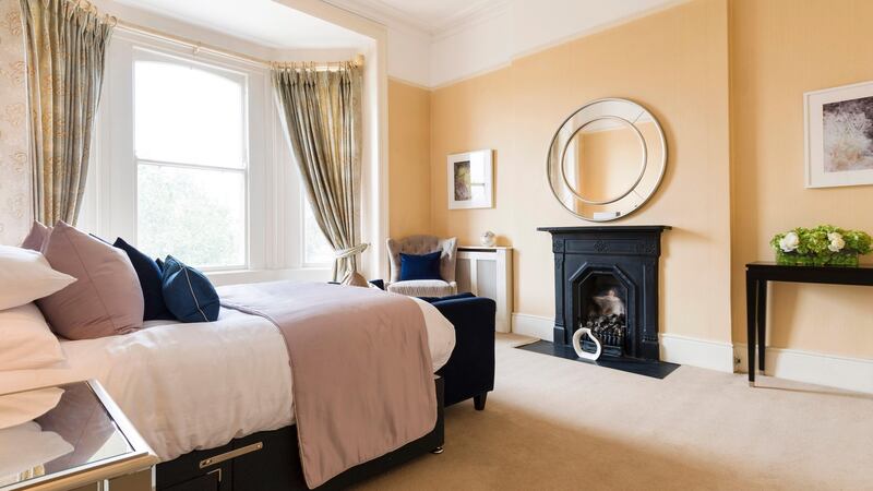 The main bedroom is overhead, on the first return. A large room, it has a couple of windows overlooking the garden and a walk-in wardrobe. A bathroom, with free-standing bath, is also on the return. The stair and landing carpet has a lush, period feel that follows into a second, rear bedroom off the first-floor landing which has a cast-iron fireplace.