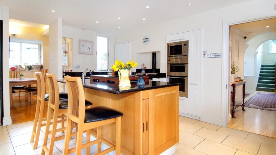 The first change they made was converting the small integrated garage to the side (one of the five bedrooms is over it) into the family kitchen. That freed up the original kitchen to become a home office. Later the kitchen was extended at the rear with the addition of an airy family room looking out onto the back garden.