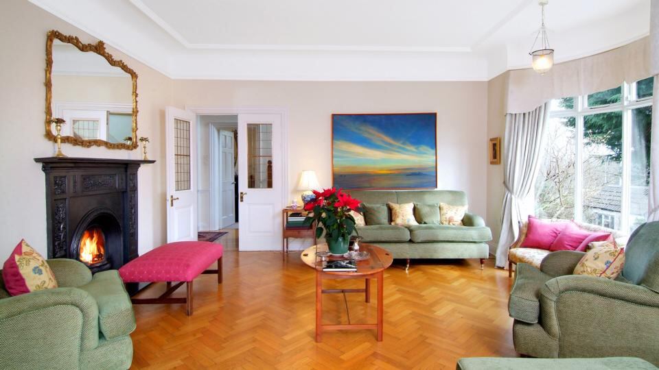 Thoughtful details show the quality of the decoration. In the living-room, for example, the floor was replaced with reclaimed oak herringbone parquet, now aged to a lovely rich colour, and the original panelled door was replaced with double doors fitted with antique window panels with copper detailing.