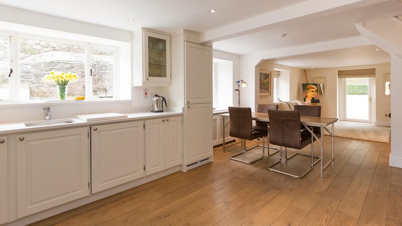 The old coal hole underneath the 12 granite steps to the front of the house has been converted into a utility allowing the kitchen to be clutter free. The kitchen, in simple whites opens into a further family livingroom, which also has an open fire.