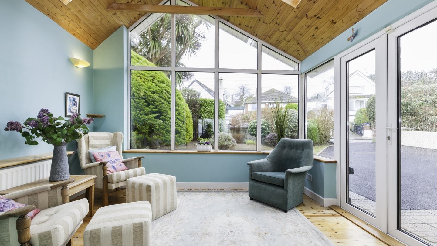 The living room and dining room both have coving and recessed lighting. The dining room features an internal window that looks into the entrance hall that opens into a small glazed reception room – called a conservatory in the brochure – at the front of the house. It’s connected to the living room by glazed double doors. Sliding doors from here open into a sunroom at the back of the house. The sunroom has a semi-solid wood floor and picture windows that take full advantage of the sea views.