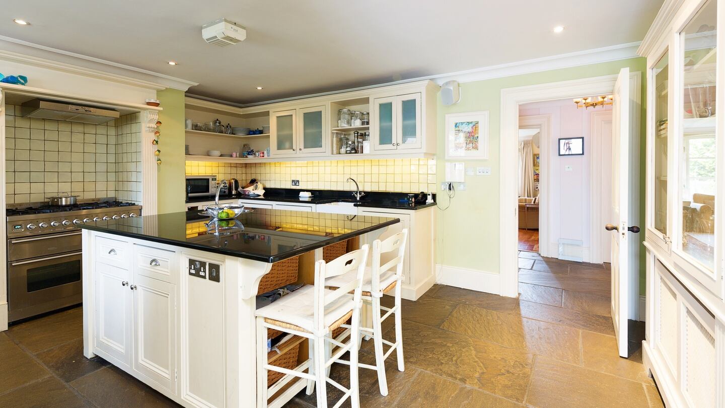 The painted kitchen with black granite counters features a large Britannia range, deep Belfast sink and lots of storage.