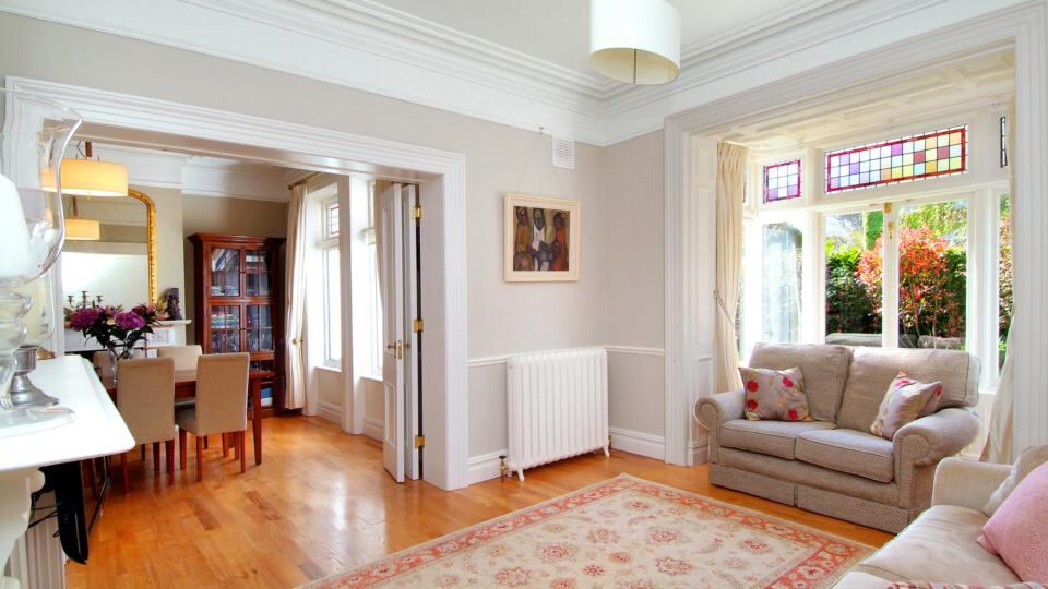 Period details – deep ceiling coving, timber and marble fireplaces, dado rails and so on – are intact, but most striking are pretty stained-glass sections in most windows, recreated in the extension.