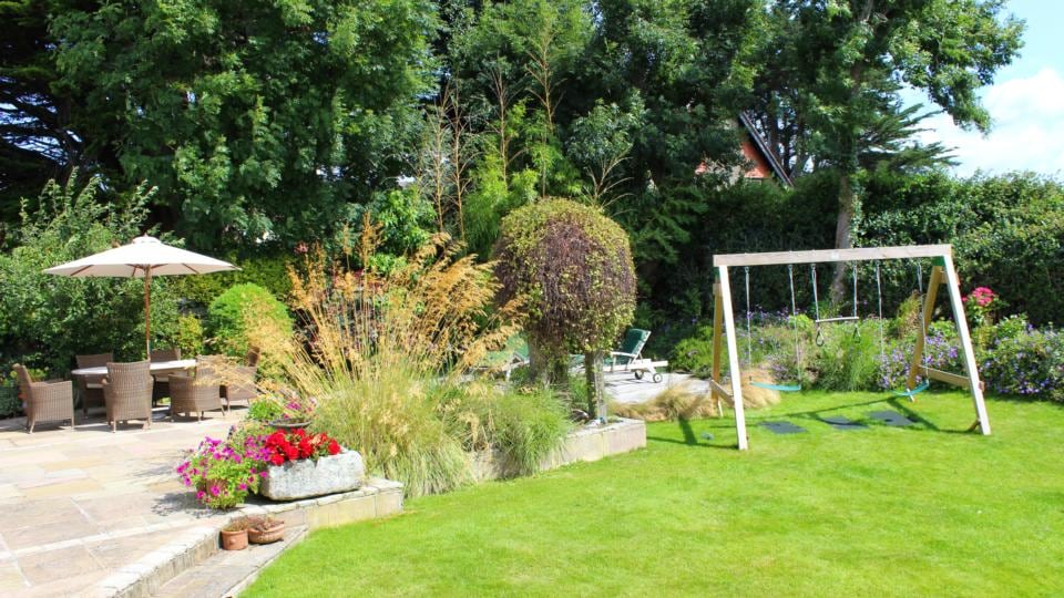 The extension opens on to a wide, sheltered back garden, with a patio that runs the width of the house and a lawn with plenty of room for play equipment.