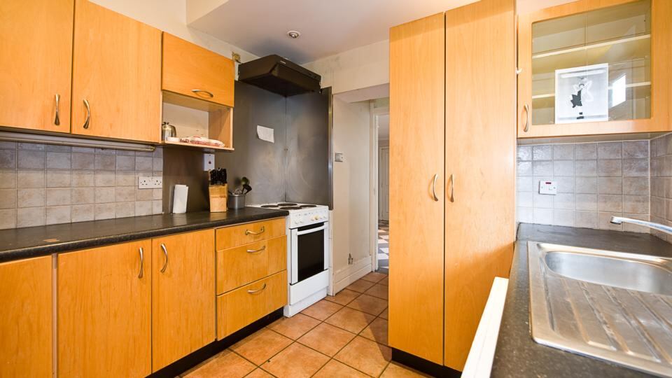A large extension to the rear is home to what the agent calls a diningroom, with a small Victorian range surrounded by bare brick occupying the original fireplace. The house has been extended to house a galley-style kitchen, utility room, shower room and a bedroom with en suite bathroom. Reconfiguring these to make one large open-plan kitchen/living/diningroom would take advantage of the westerly aspect of the back yard.