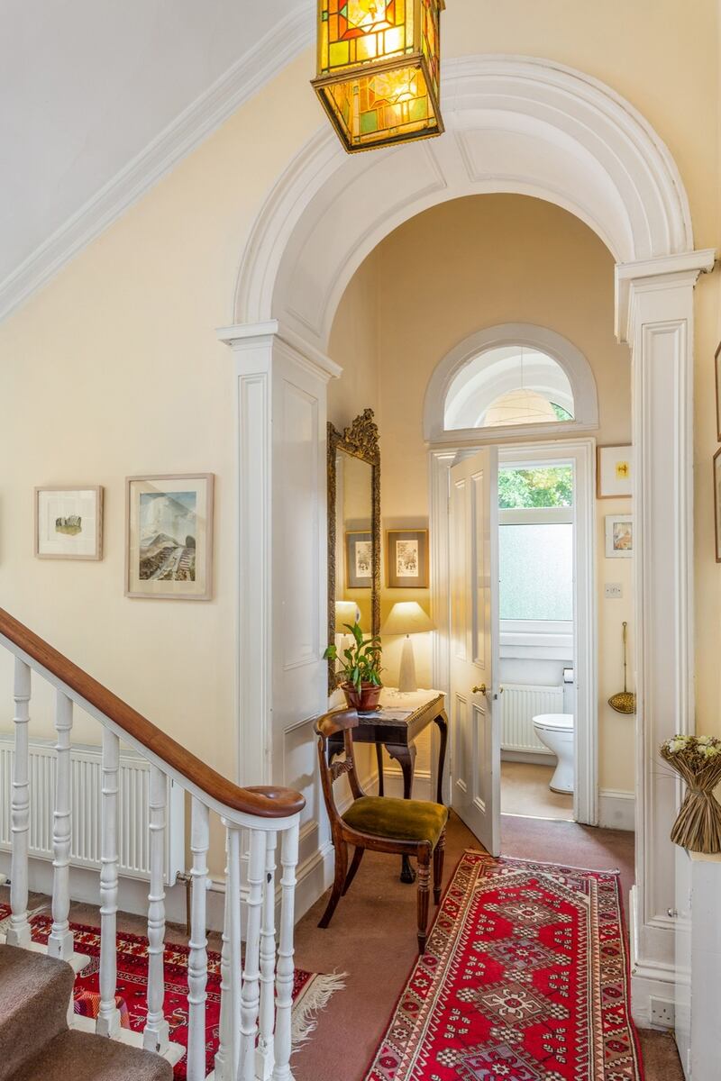 The house extends to 295sq m 3, 175sq ft over thee floors. There is a small kitchen at hall level with a small breakfast room off it, and a sun room to its rear where there are steps leading down into the garden.