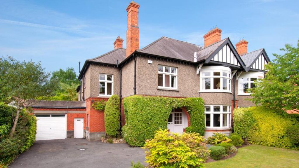 It’s an executor sale – for €2.5m through Sherry FitzGerald – and once inside the lovely square-shaped hall it is immediately obvious that this is a well-cared-for, comfortable family home. Built in the 1930s it is one of six similar houses on the road, which is mostly lined with much older houses. Some of its features are typical of the time: deep bay windows, that welcoming hall, stained glass, tall ceilings and plenty of rooms.