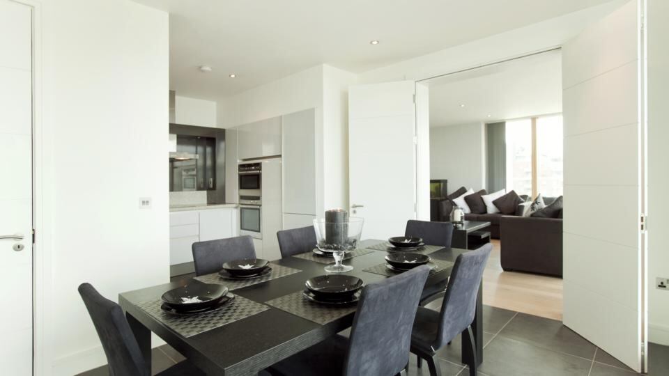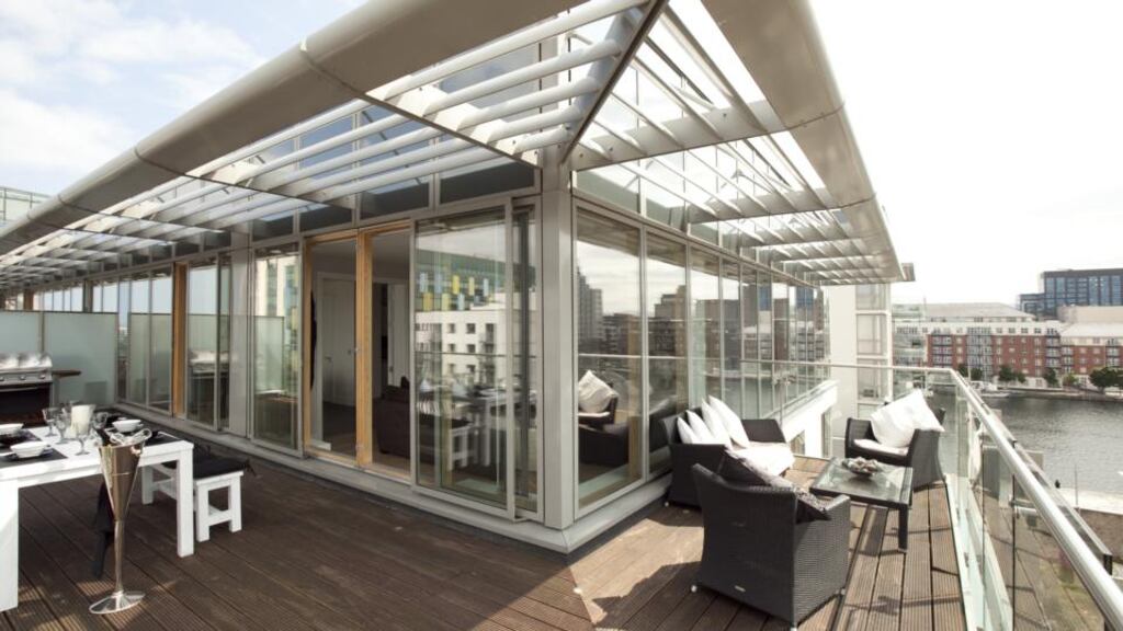 Entry to the building is on Hanover Quay and the 101sq m (1,087sq ft) apartment opens into an L-shaped, tiled hall. In the living area to the right two floor-to-ceiling windows open on to a wraparound terrace that overlooks the Liffey to the north, and Hanover Dock and the Dublin mountains to the south. The room is bright, with high ceilings and white semi-solid oak flooring.