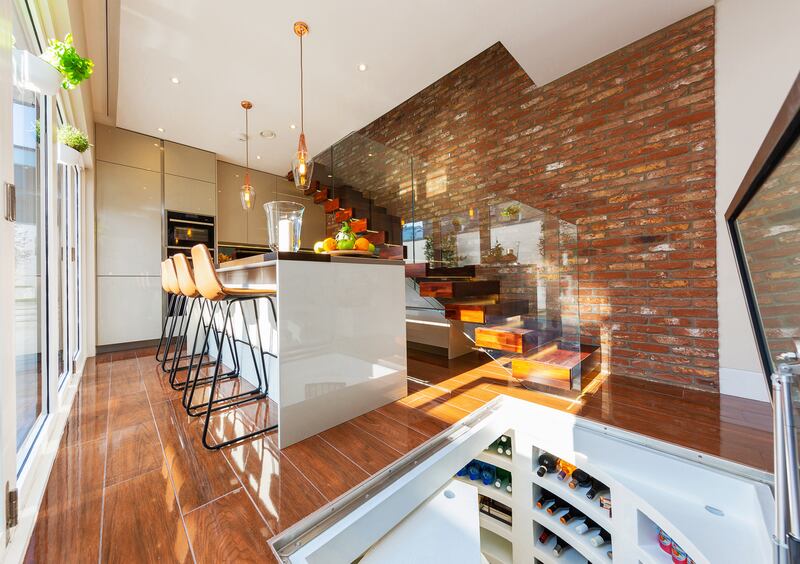 There’s underfloor heating for comfort – under the walnut effect glossy tiling – and CCTV for security. It all adds up to a technologically advanced, A-rated house but one feature that will really stand out for viewers as they walk around is the one they stand on – a glass door in the floor of the kitchen/living room. Remotely controlled, it opens to give access down to a circular, shelved cellar with space for 4,000 bottles of wine.
