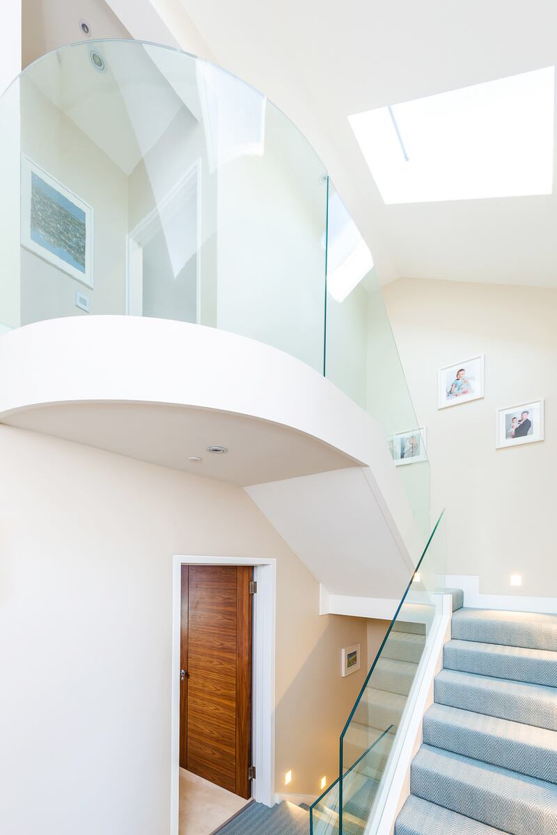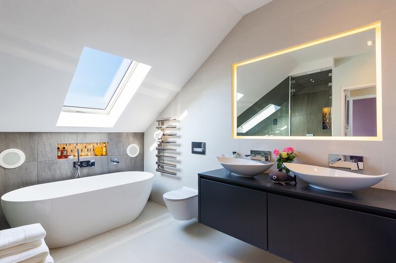 The rest of the ground floor is open plan with two staircases, an unusual feature in a 179sq m (1,926sq ft) house. One is an open tread, glass-panelled walnut staircase beside the kitchen that leads up to a large home office in the return, the other leads up to the bedrooms, the largest being to the rear with a full-size bathroom en suite and walk-in wardrobe. The bathroom at the top of the house – beside the fourth bedroom – contains a steam room.
