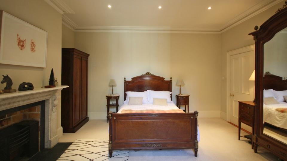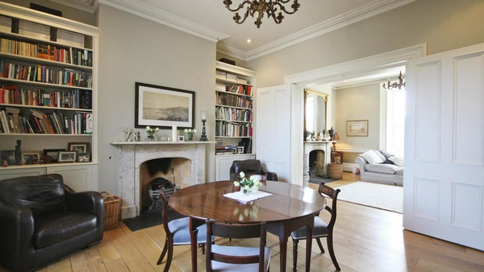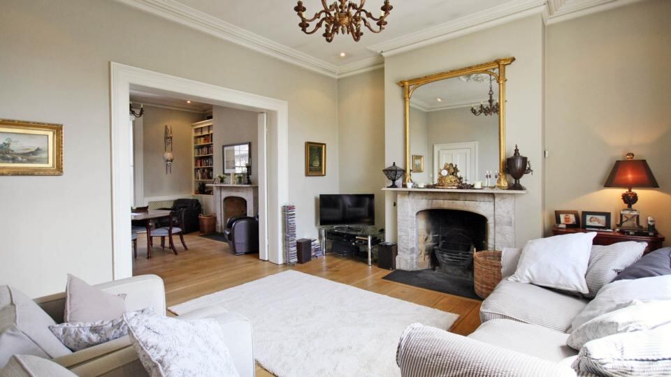The main interconnecting reception rooms are elegant, with wide-plank oak floors, high ceilings, intricate plasterwork and matching grey marble mantlepieces.