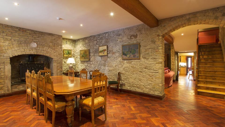 Exposed granite walls frame a dining and living room with herringbone teak parquet floors. Both rooms have raised brick fireplaces with huge stoves and they lead to a pine and granite kitchen.