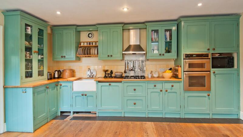 What’s lovely about the reception room layout is that the double sitting room scenario adds valuable chill-out space at entrance level. The dining room is down a wide set of steps in an L-shaped room that is connected to the solid wood sea green coloured kitchen. The sizeable space has double doors that lead outside to the patio.