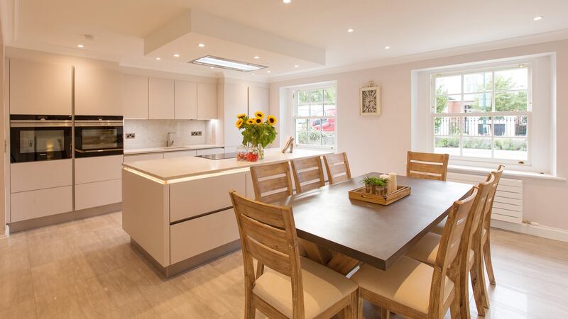 Kay Egginton of Eco Design in Santry created the kitchen at garden level, which also features a separate pantry and utility. The slick design, with spring-loaded units – where the presses open on touch – lends a seamless feel to the room.
