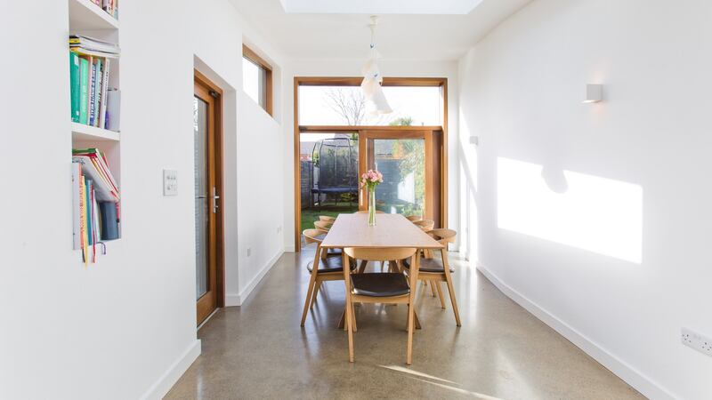 When they bought the house they commissioned architect Aoibheann Ní Mhearáin of Anima architects to design the extension, saying now that she listened to all of their requirements, particularly in relation to light and storage. So as well as the generous windows and doors in the extension there is a large roof light over the kitchen part of it, and her bespoke units, simple white cupboards topped with Silestone, include a wall of hidden storage. The floor throughout the kitchen and dining area is polished concrete.
