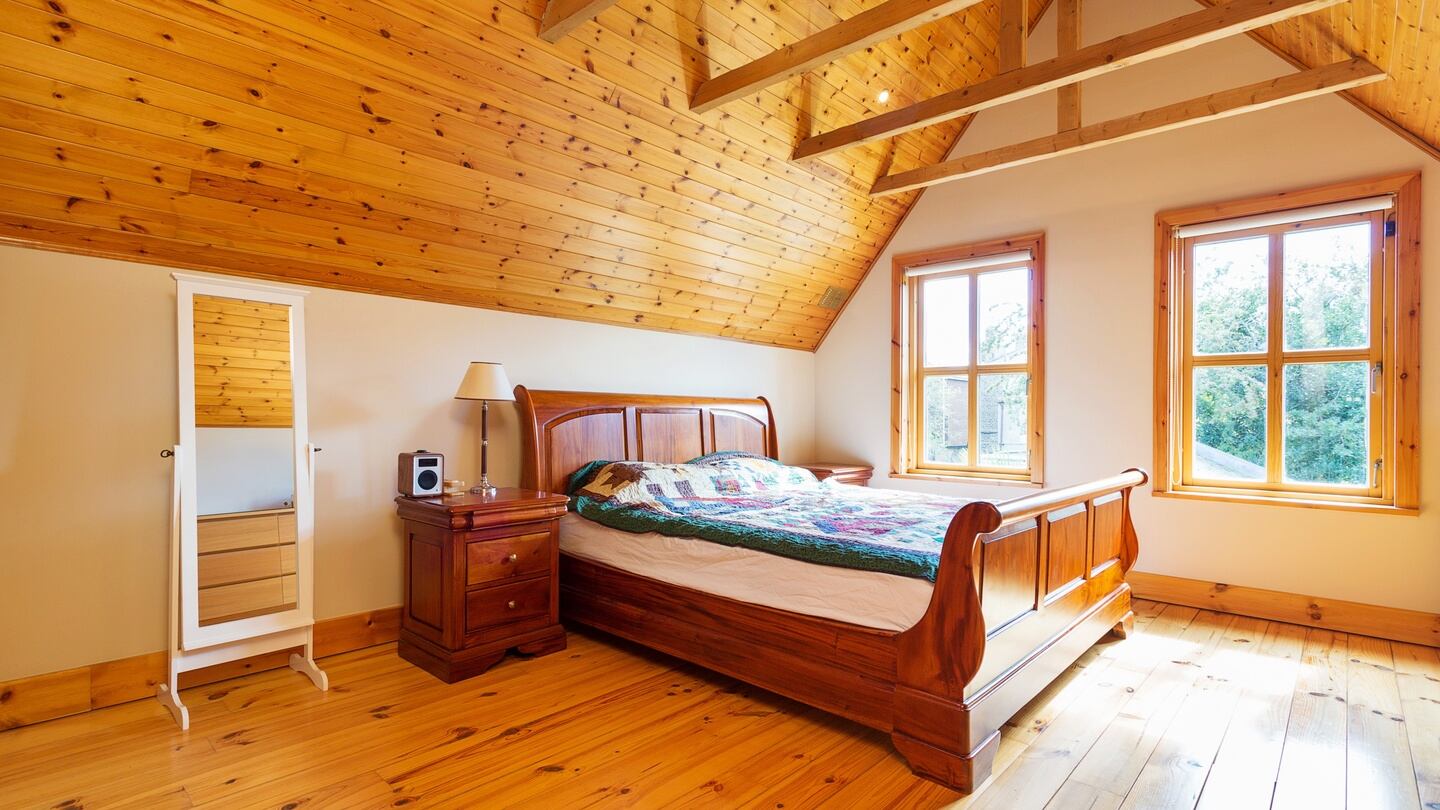 22 Castlewood Terrace features a number of stained wood finishes, from timber window frames to wood floors, pine doors, skirting and even the vaulted ceilings of the large master bedroom. If it’s not to taste, there’s always an option here to paint over the wood.