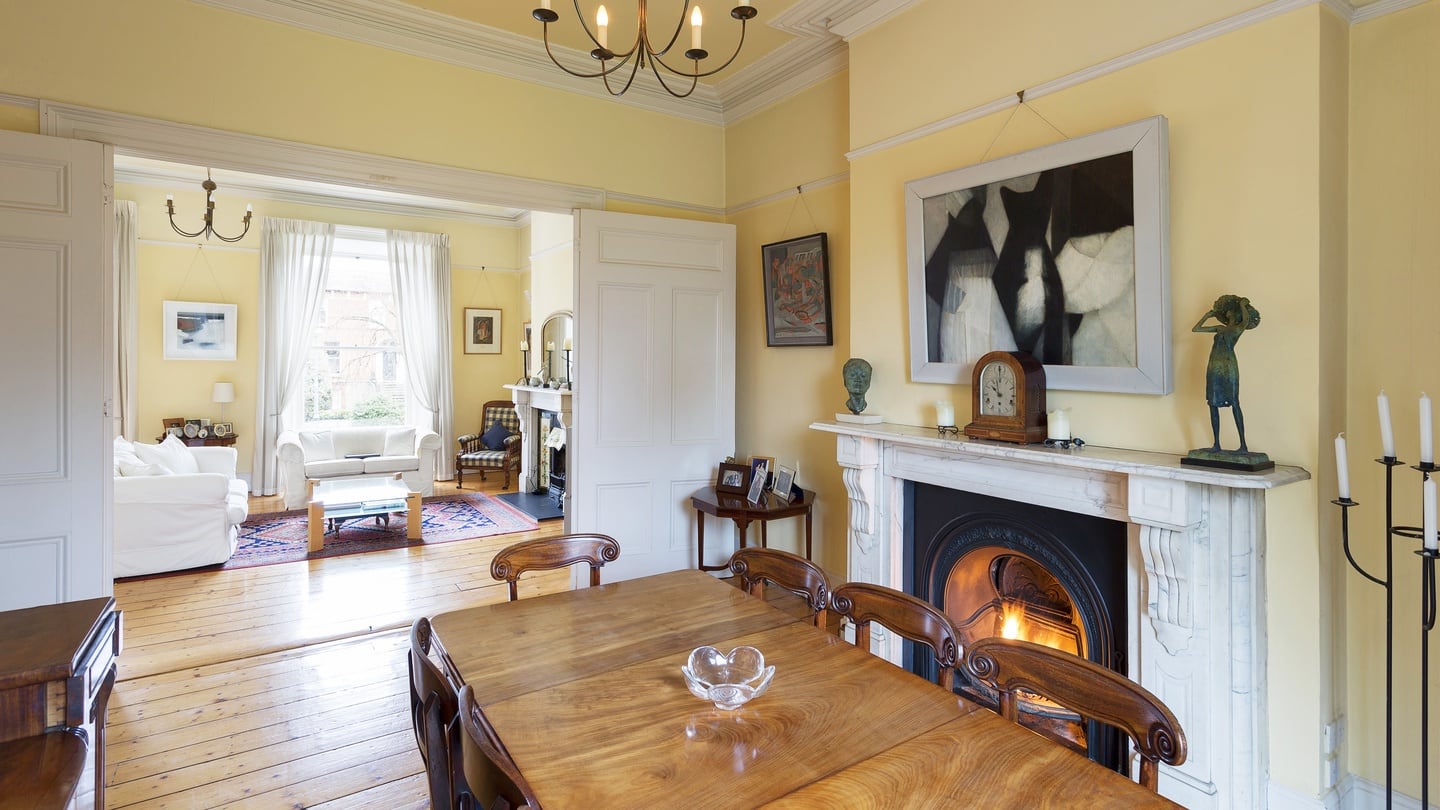 The fine livingroom runs the width of the front with two tall sash windows, high ceilings and the expected period details such as a fine fireplace and a decorative plasterwork. It opens into the diningroom at the rear.