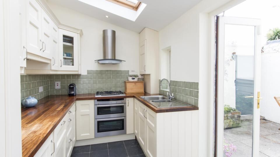 Then, when the couple had the money, they upgraded the kitchen, investing in a painted kitchen from In-House. Situated at the back of the house, it feels bright and airy thanks to the judicious use of large-format roof lights. There is a small south-facing yard to the rear that has pedestrian access.