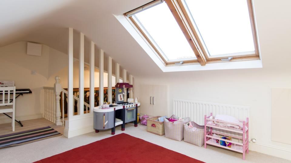 The two other bedrooms are large doubles with the main bedroom at the front of the house also having a spacious en suite. These bedrooms have high ceilings and period fireplaces. A full staircase, with replica banisters – a sign of the quality of the renovation back in 2003 – leads up to the attic conversion where large Velux windows give light. The children use this as a playroom and the space is not counted in the square footage.